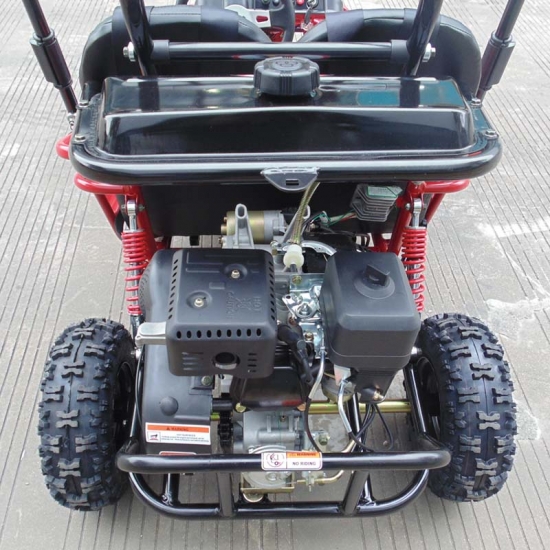 É um assento duplo, suspensão completa kart equipadornCom o início elétrico do motor de 163 cc, 5.5hp com o arranque inicializado e os recursosrn2 rodas motrizes e embreagem centrífuga, simples no controle com pedais de pedal / stop. A transmissão é fácil de usar totalmente automática com inversarnCom cinto de segurança de 5 pontos.